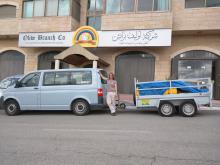 Mit einem starken VW Bus plus Anhänger, ausgeliehen von Abu Wa'el, dem Bauern, der für uns geerntet hat, konnten wir in drei Stunden Fahrt die Olive Branch Co. in Birzeit erreichen und wurden dort herzlich empfangen. Nach dem Ausladen und Wiegen des Olivenöls wurde eine traditonelle Mahlzeit aus Tomaten, Gurken, Labanei, Olivenöl!, Pitabrot, Falaffel und Tee wurde aufgetischt.