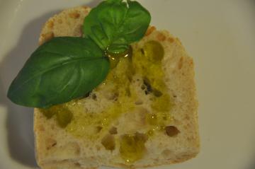 Olivenöl statt Butter oder Margarine auf eine Scheibe geröstetes Brot oder ein Brötchen gießen. Nach Belieben belegen mit frischen Kräutern, pikantem Käse... Lecker!
